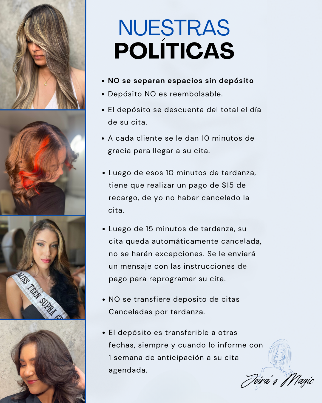 El cabello es la corona que llevamos a todas partes. Para mi es importante que las luzcas con toda la actitud. Por eso me enfoco en la salud y bien estar del cabello. Soy Jeiralis Atanacio licenciada en Especialista en belleza (Cosmetóloga) y maquillista profesional. Comprometida en brindarte un servicio de alta calidad.