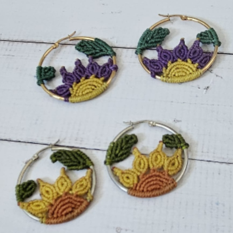 Disponibles en diferentes combinaciones de color (flor púrpura y amarilla, o tonos cálidos tierra), estos aros son ideales para quienes aman lo natural, lo boho y lo hecho a mano.